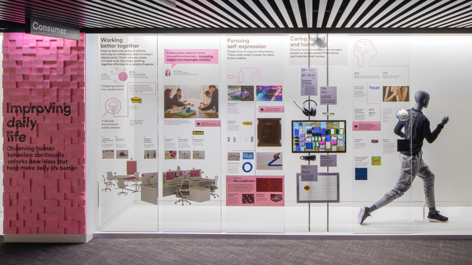 A modular glass panel design system for 3M’s Washington D.C. innovation center. A suitable layout and typographic hierarchy was developed to enable consistent display of content across all business groups. The unique interplay between printing on the front and back of the panels created dynamic interaction and depth to the system.